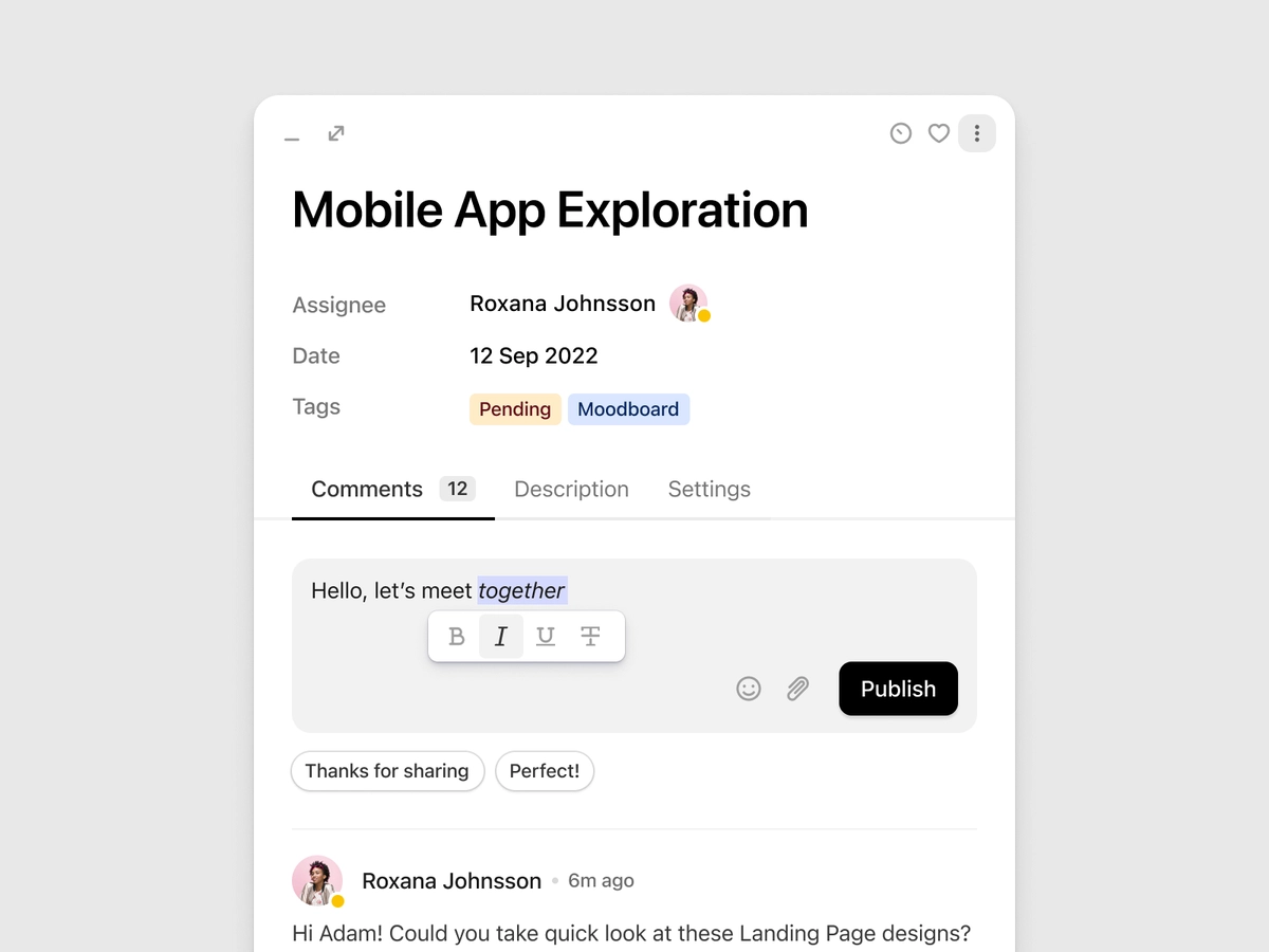 On point. Express yourself with emoji reactions. You can react to comments, threads and even task updates.
